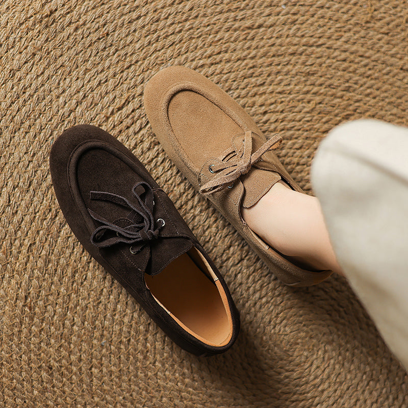 Women's Suede Leather Lace-Up Boat Shoes Round Toe Casual Driving Loafers in Deep Brown/Coffee