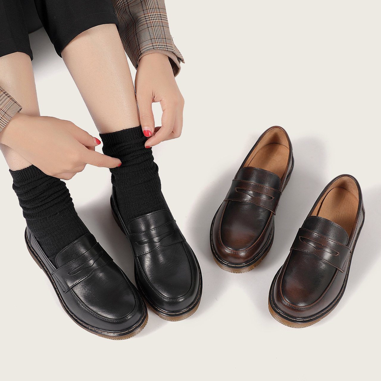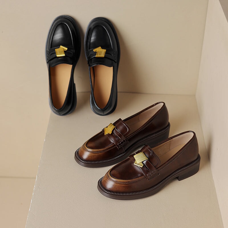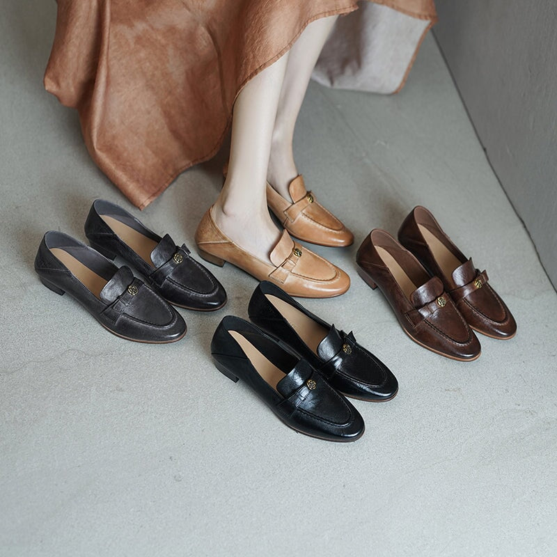 British Style Washed Horse Leather Penny Loafers with Metal Camellia Black/Grey/Brown/Apricot