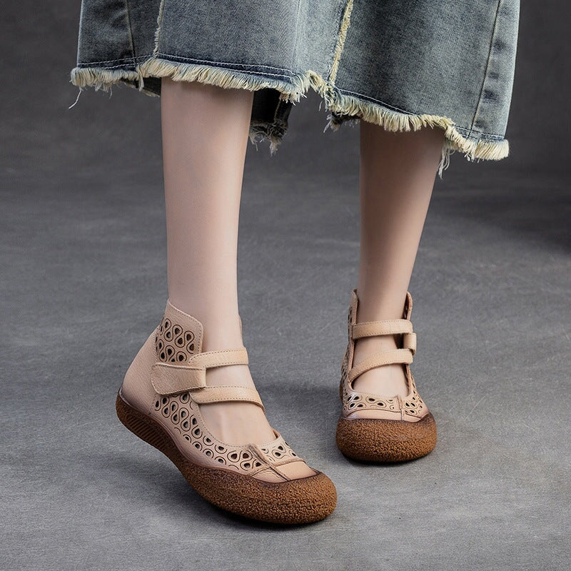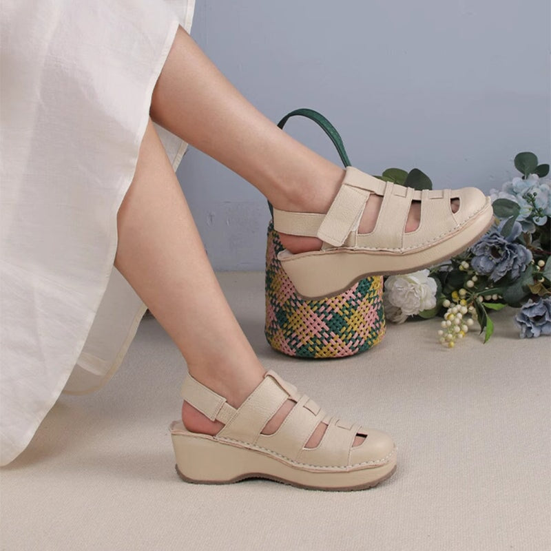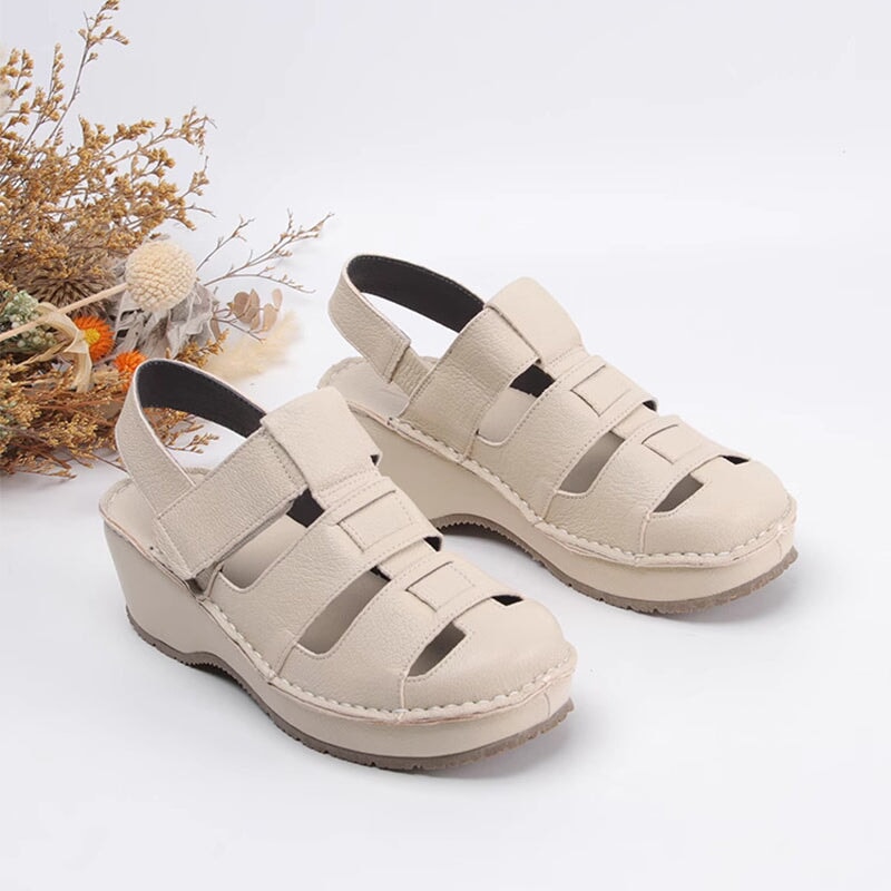 Retro Hollow Out Leather Sandals 58mm Round Toe Closed Toe Cylinder Heel Shoes in White/Yellow Brown