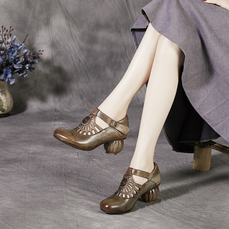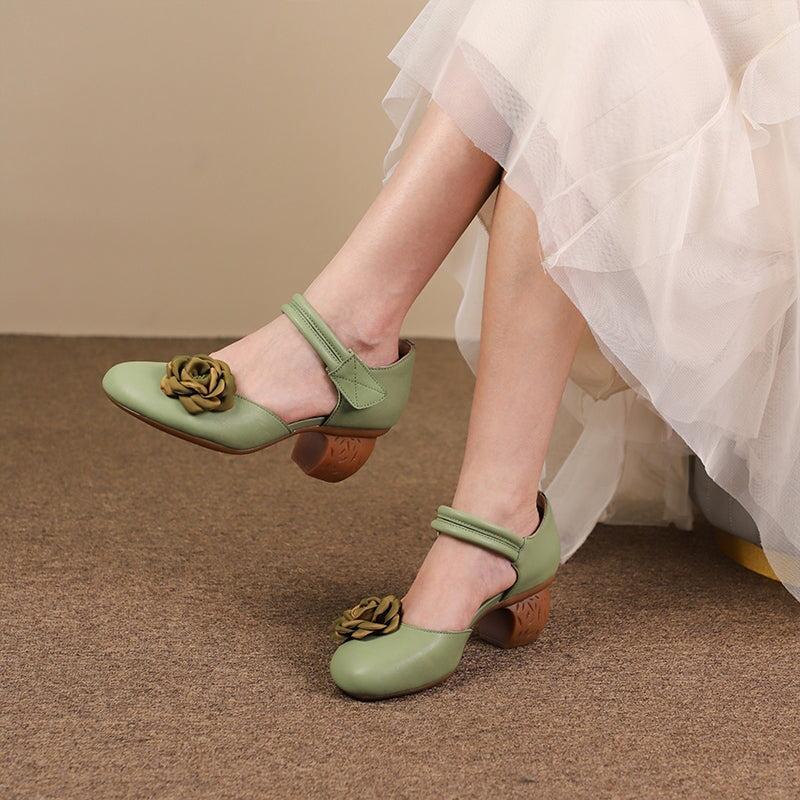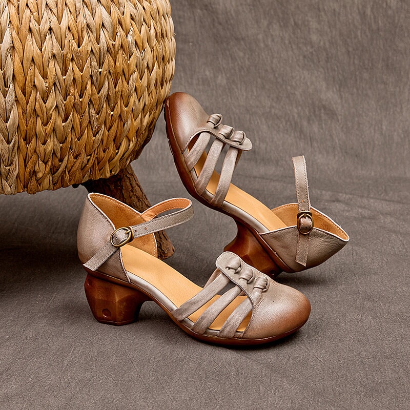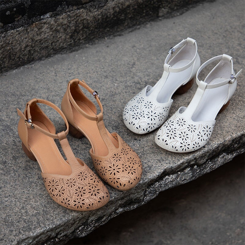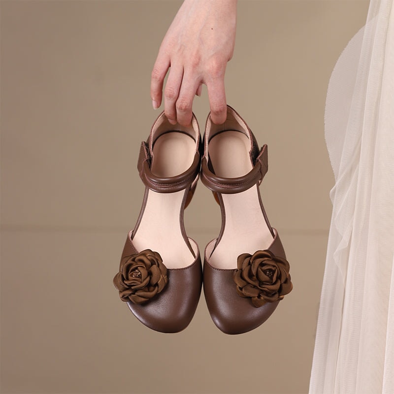 Sweet Flower Handmade Leather Mid Heel Women's Shoes Round Toe Retro Buckle Sandals Brown/Off White