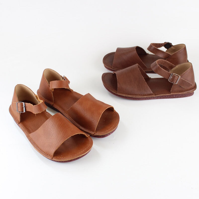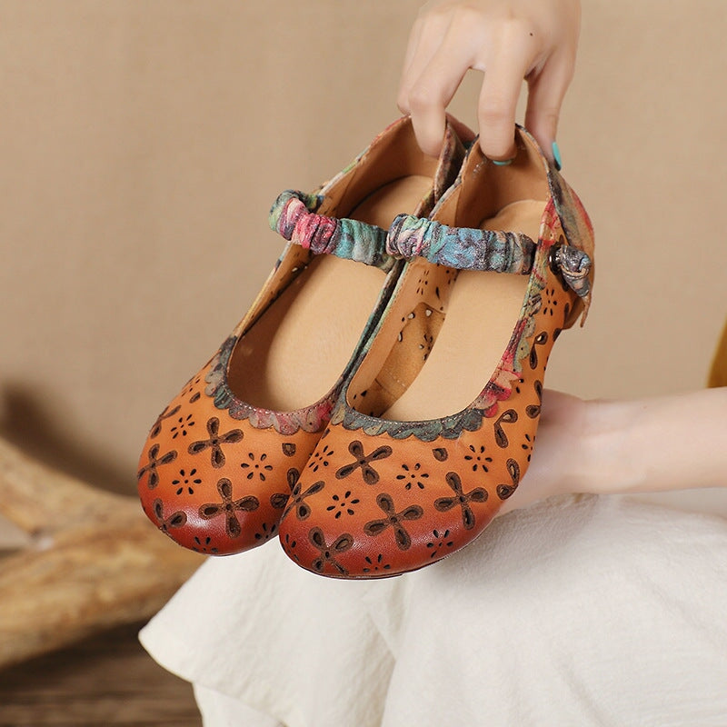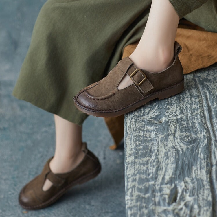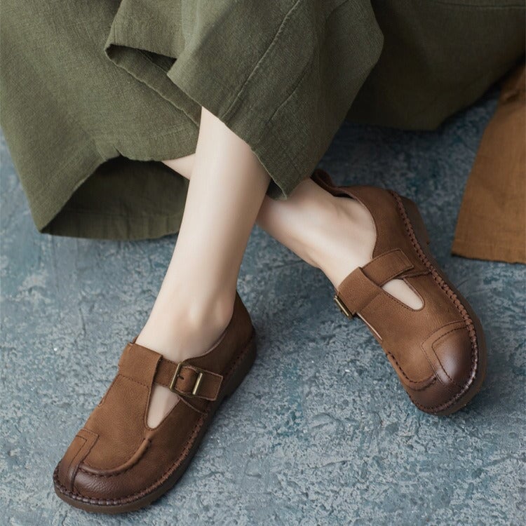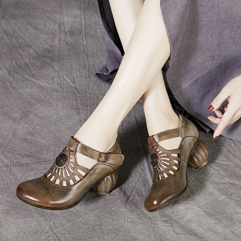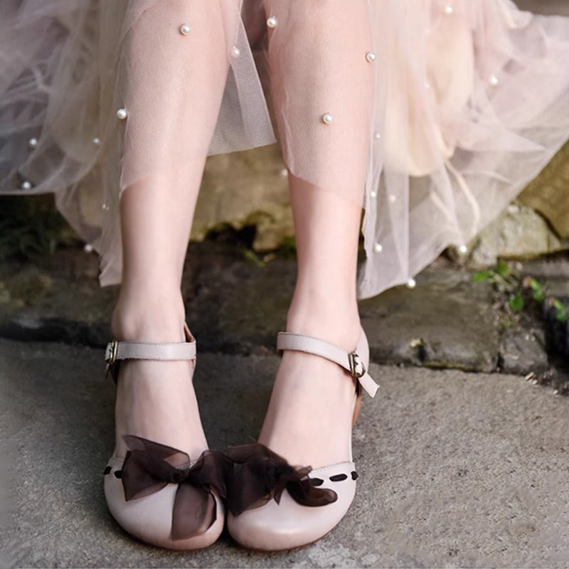 Sweet Flower Handmade Leather Mid Heel Women's Shoes Round Toe Retro Buckle Sandals Brown/Off White