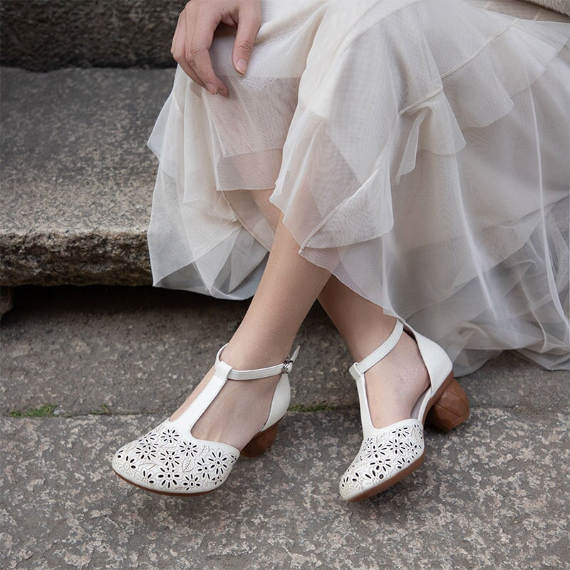 Retro T-Strap Hollow Out Leather Sandals Round Toe 58mm Cylinder Heel Shoes in White/Yellow Brown