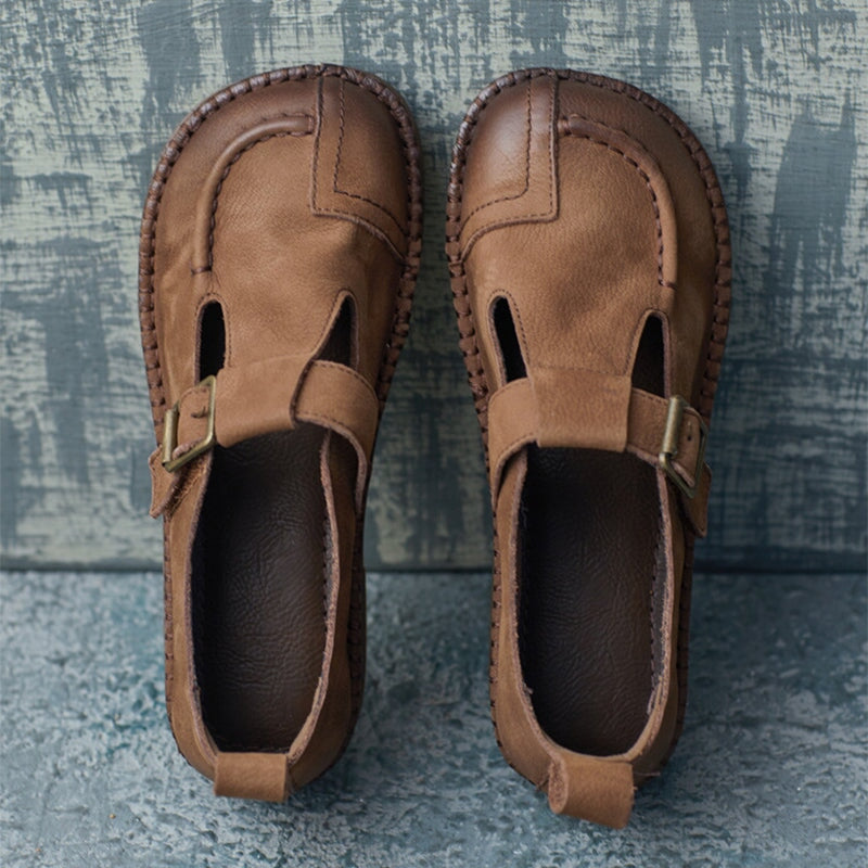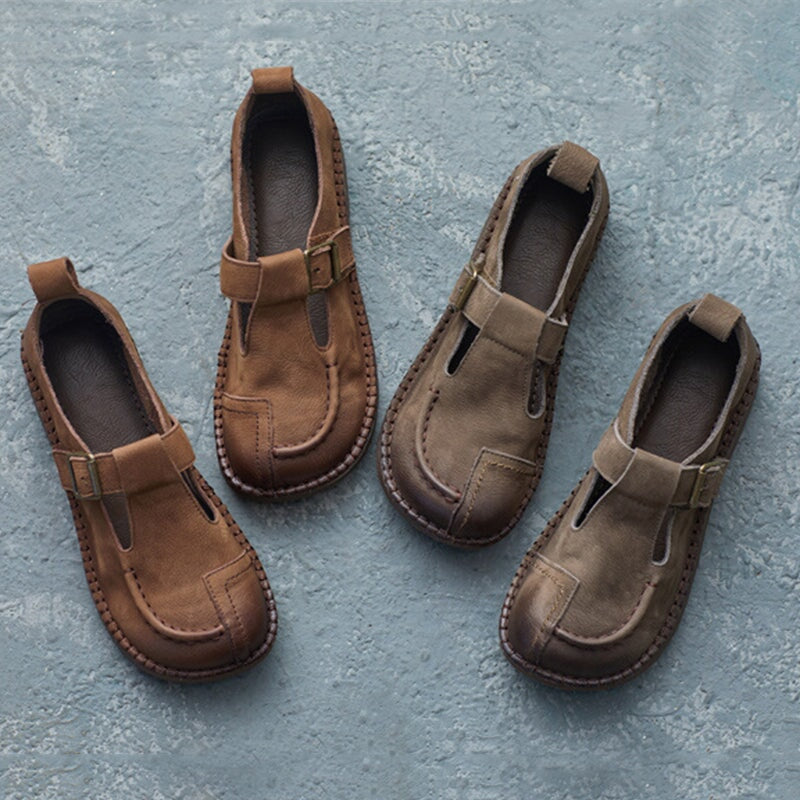 British Style Handmade Buckle Strap Flats For Women Round Toe In Dark Grey/Coffee