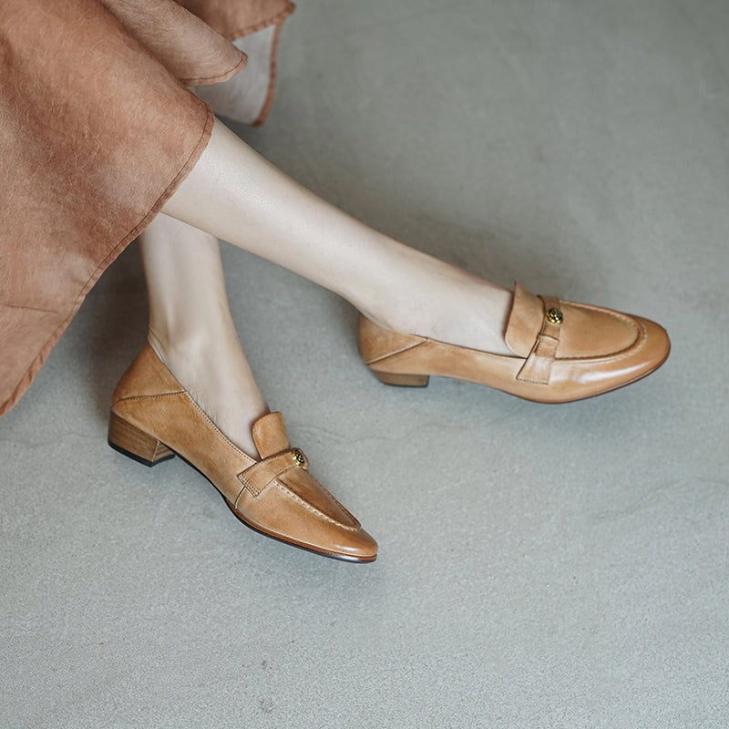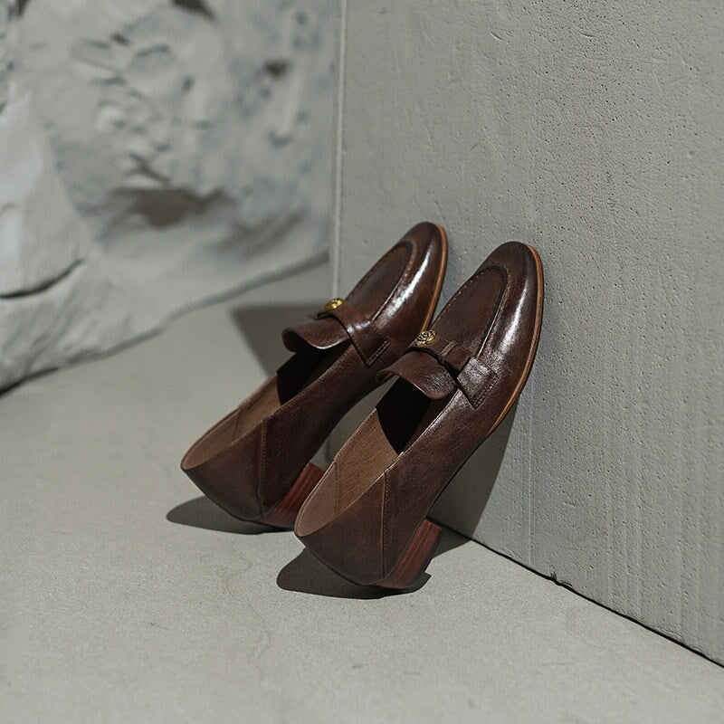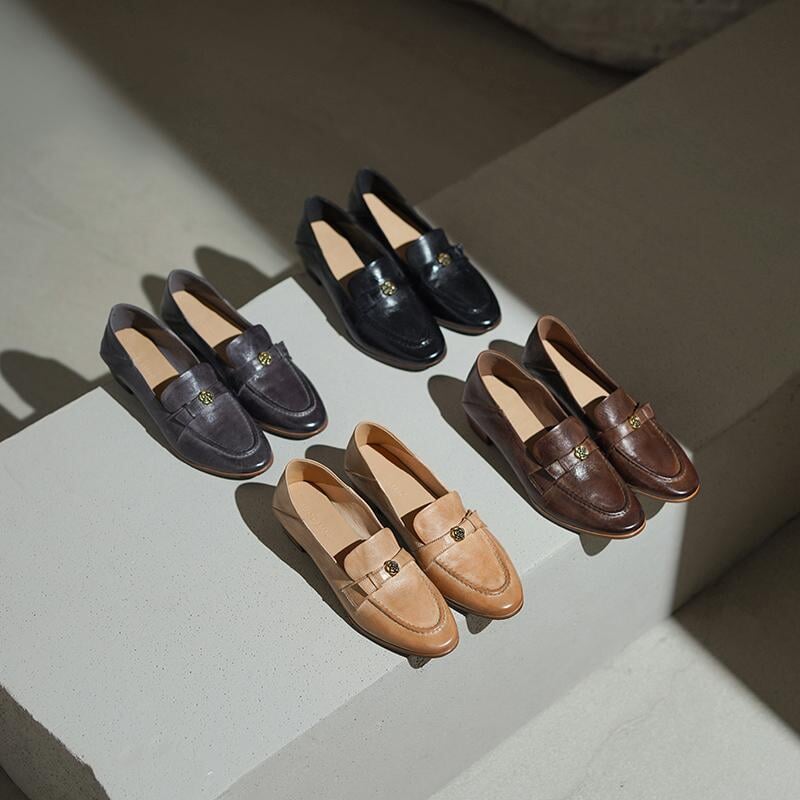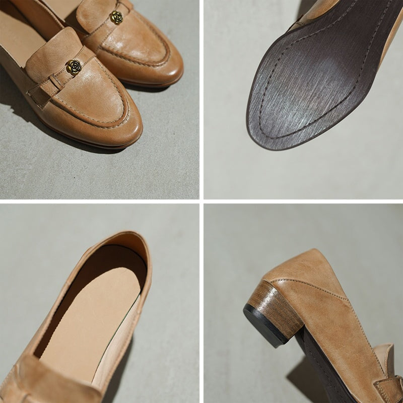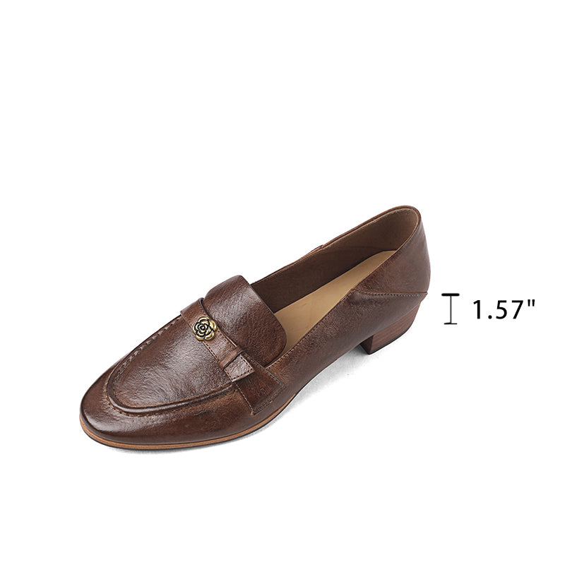 British Style Washed Horse Leather Penny Loafers with Metal Camellia Black/Grey/Brown/Apricot