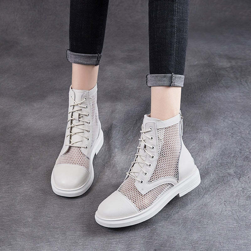 Handmade Genuine Leather Summer Boots Breathable Off White/Black