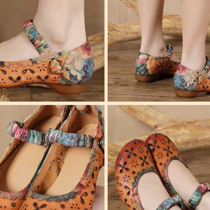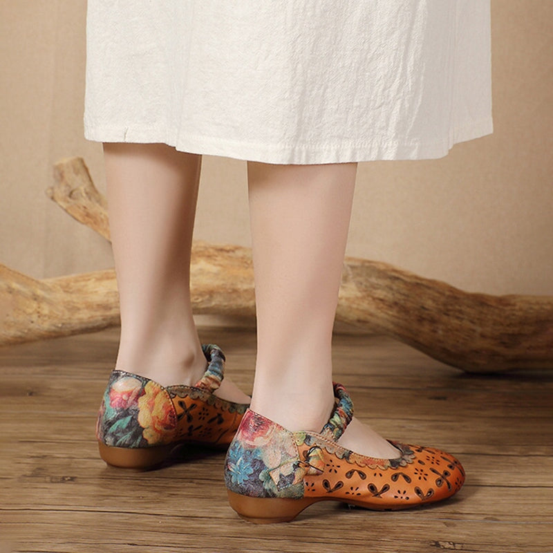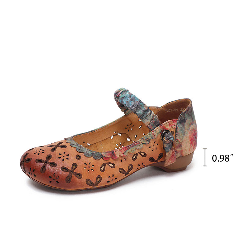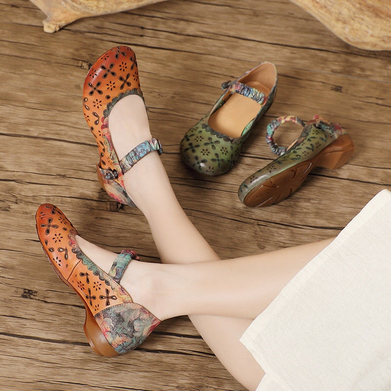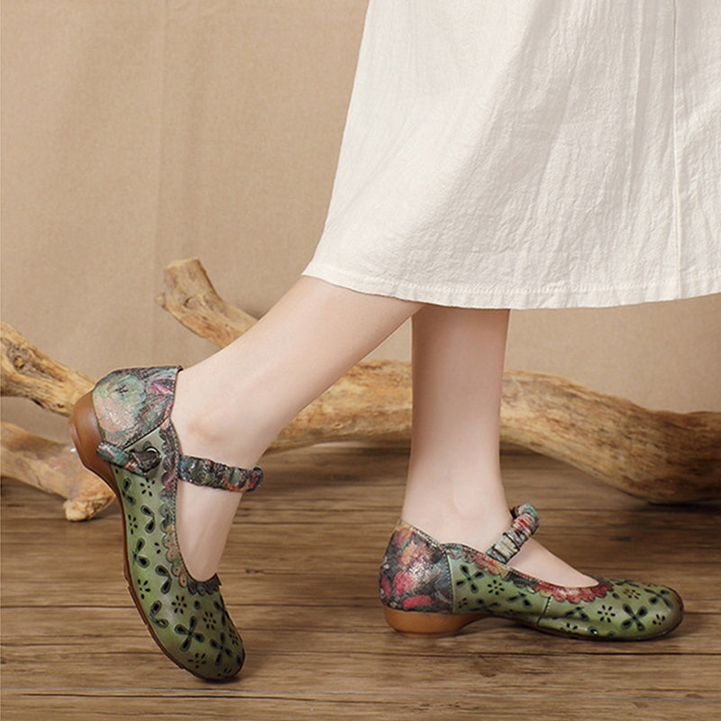 Handmade Leather Mary Jane Sandals Women Round Toe Retro Cut Out in Camel/Green