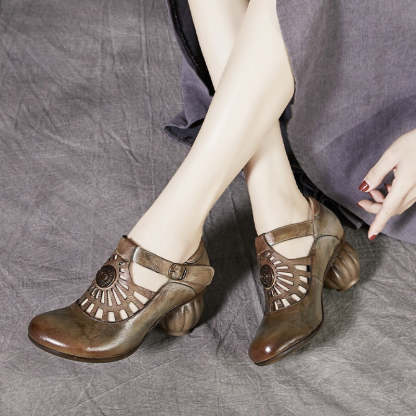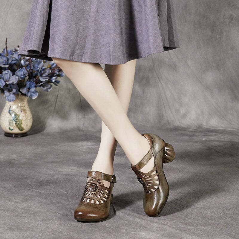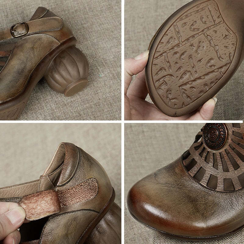 Handmade Leather Pumps Mid Heel Mary Jane Sandals Round Toe Retro Buckle Sandals Gray