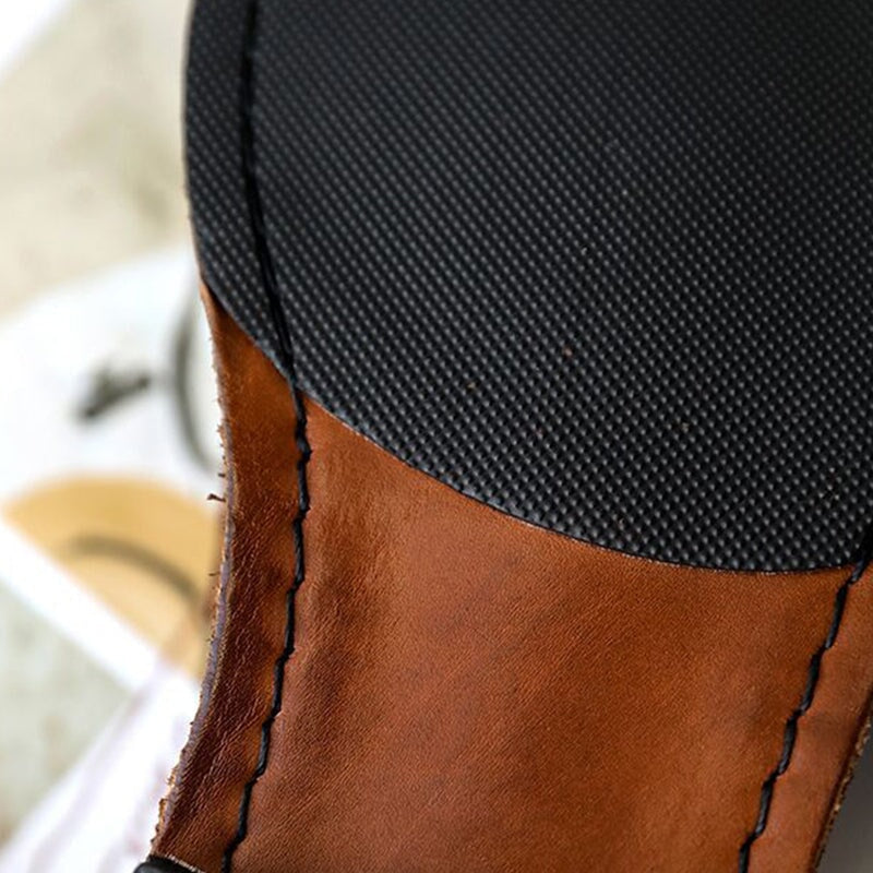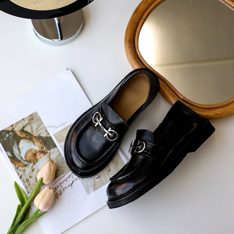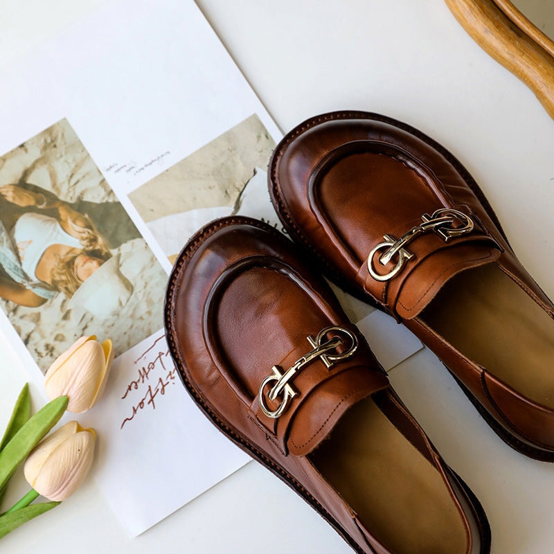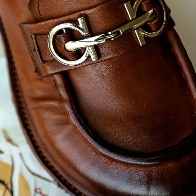 Horsebit-Detailed Handmade Leather Low Block Heel Loafers For Women In Black/Coffee