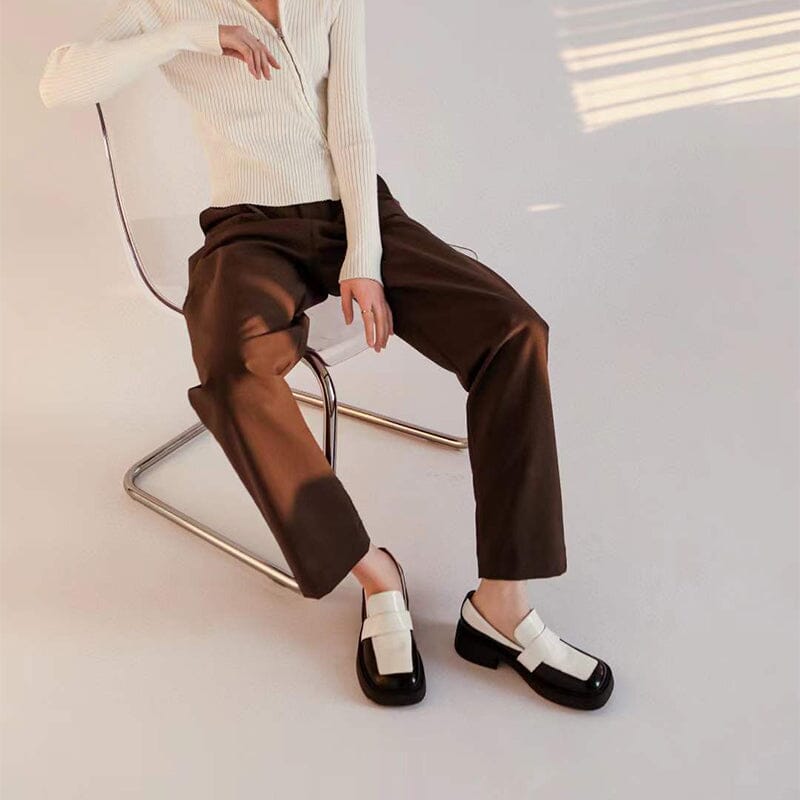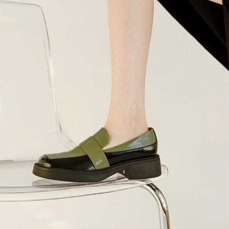 Square Toe Leather Penny Loafers for Women Color Blocking in Green/Brown/White