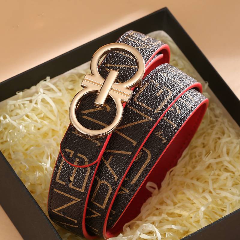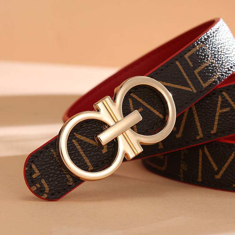 PU Leather Belts with Letter Pattern and Double Mirrored G Letter Metal Buckle