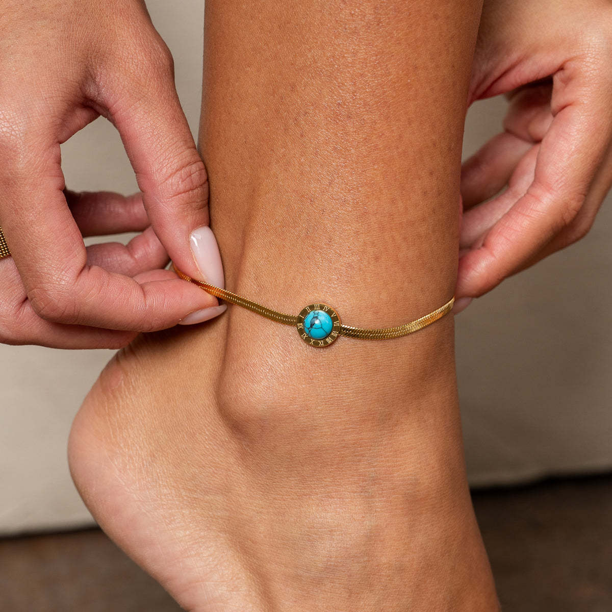Aqua Stone Snake Chain Anklet - Gold