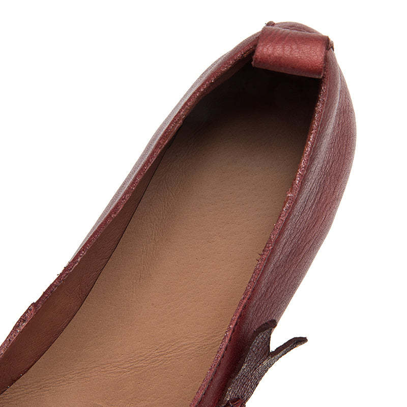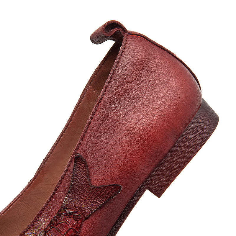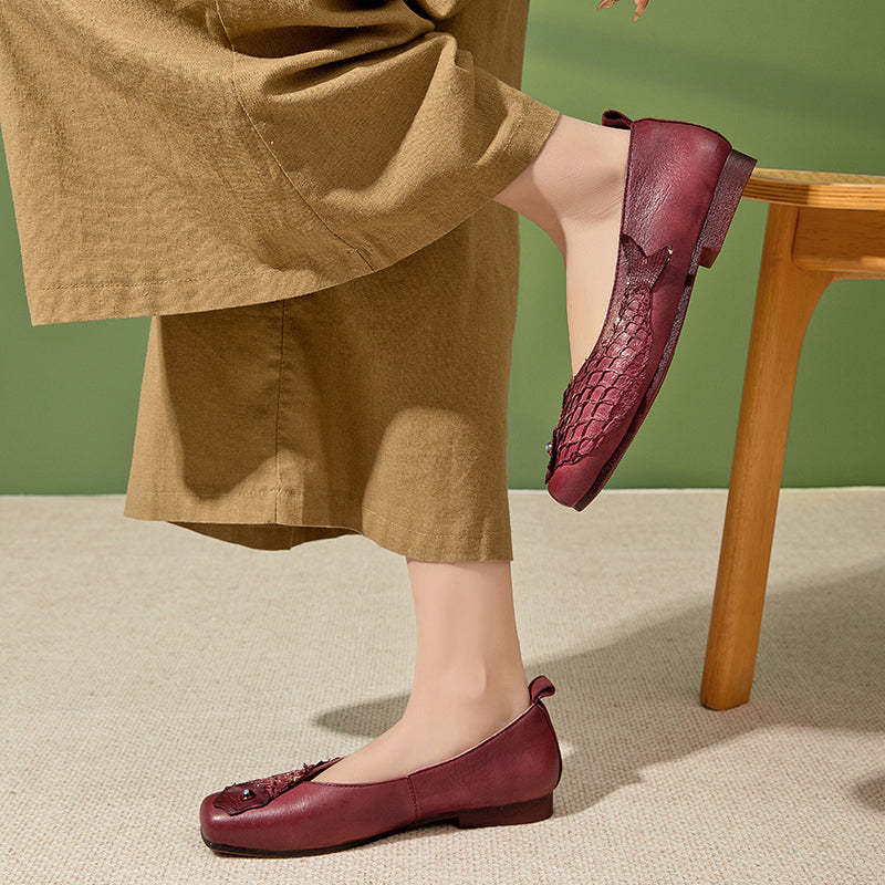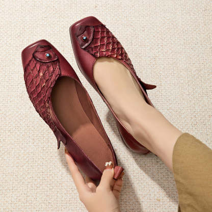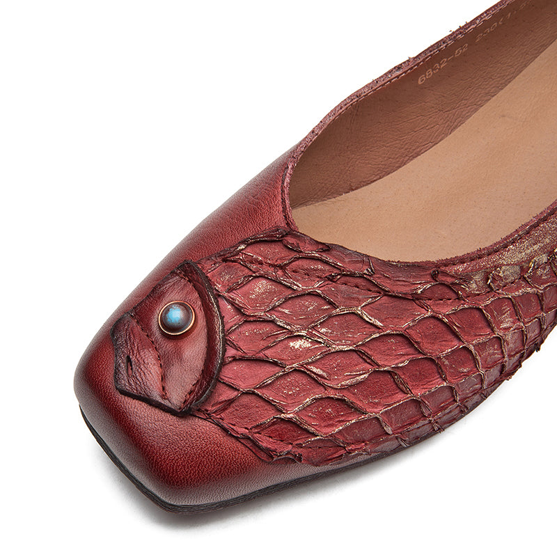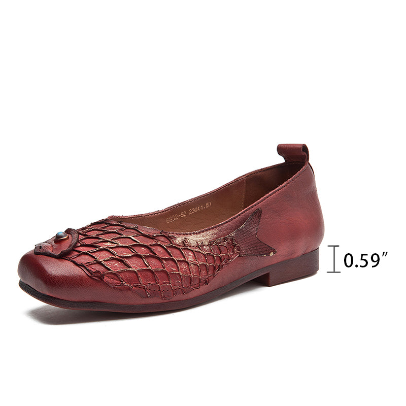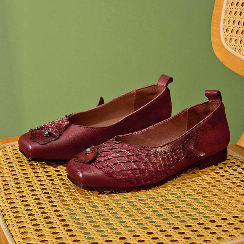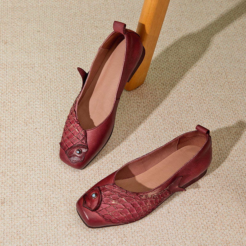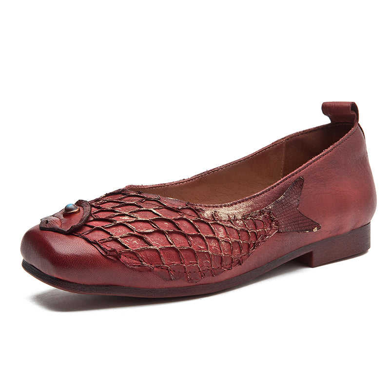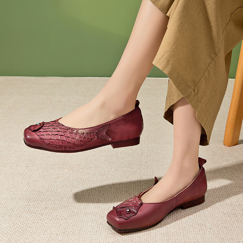 Original Ethnic Style Soft Leather Flats Square Toe Fish Totem Casual Loafers in Red