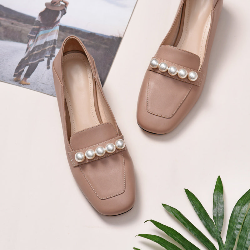 Pearls-Detailed Leather Loafers for Women Black/Bean Paste