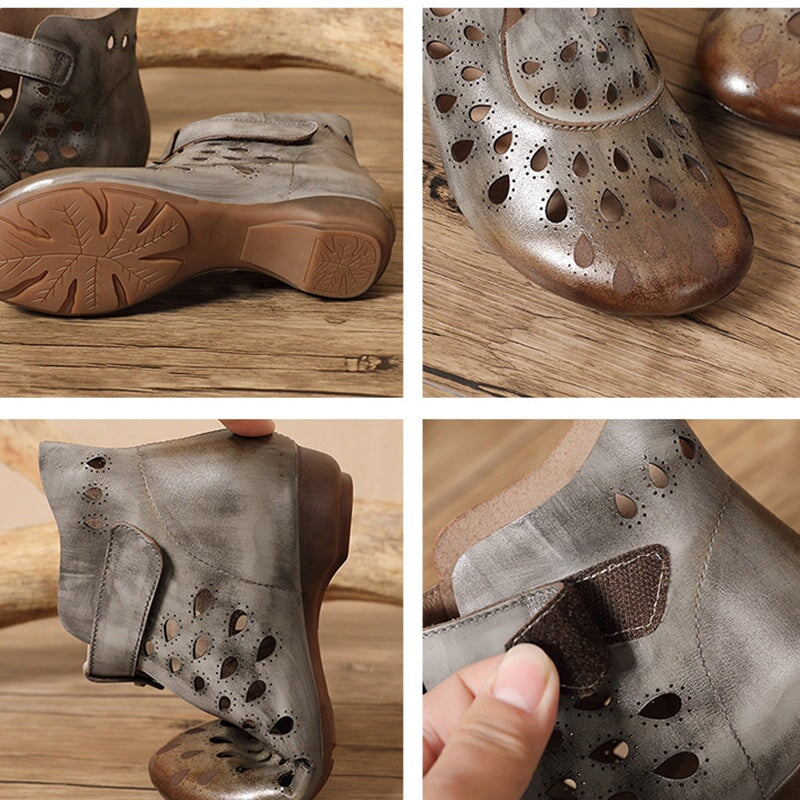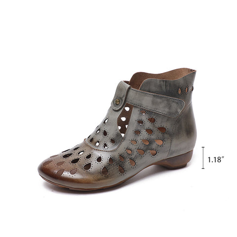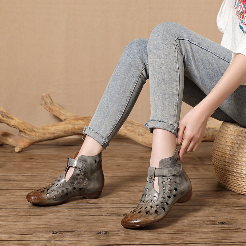 Perforated Leather Boots T Strap Gladiator Sandals for Women in Grey