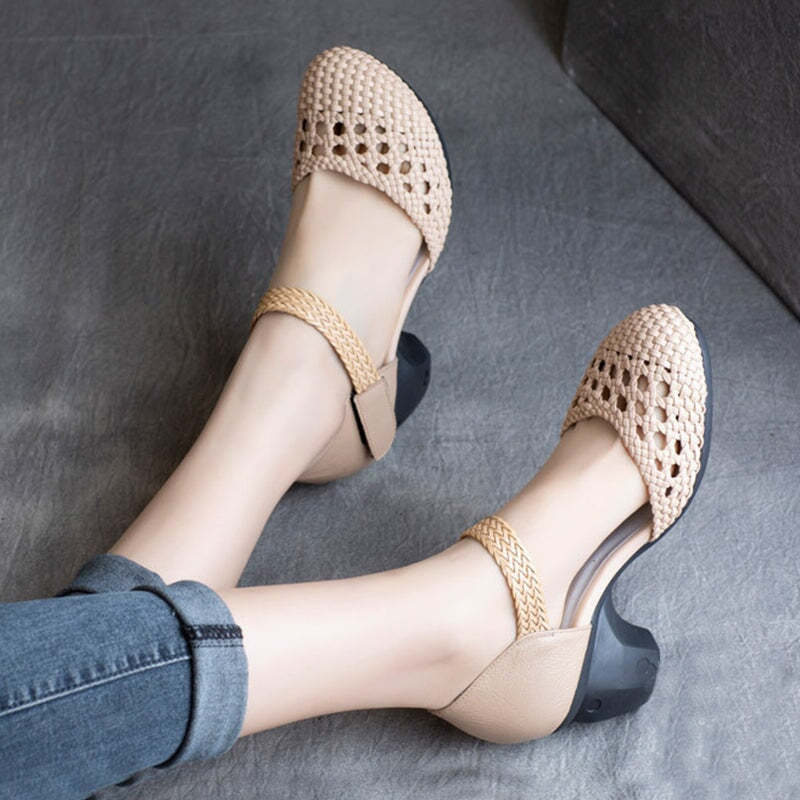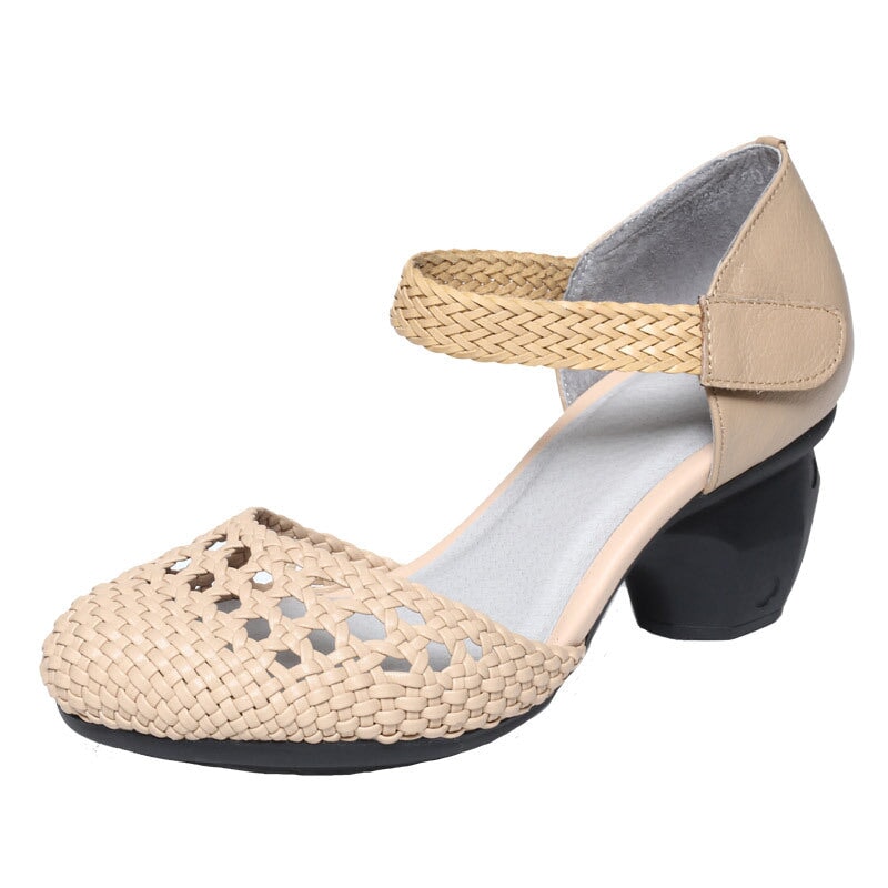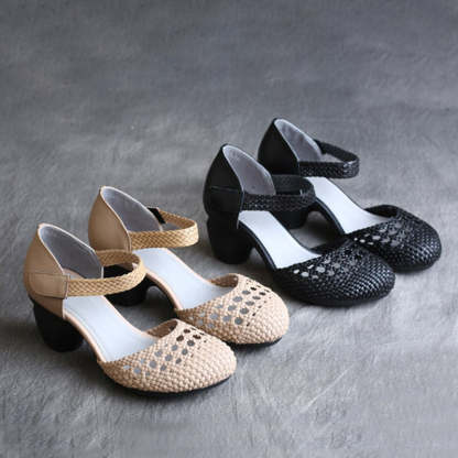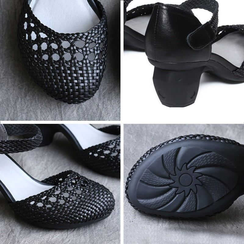 Retro Cowhide Chunky Pumps Hollow Design Mary Jane Sandals In Black/Apricot