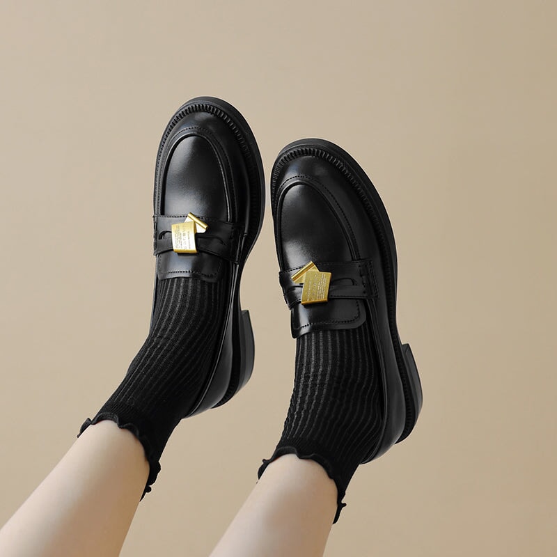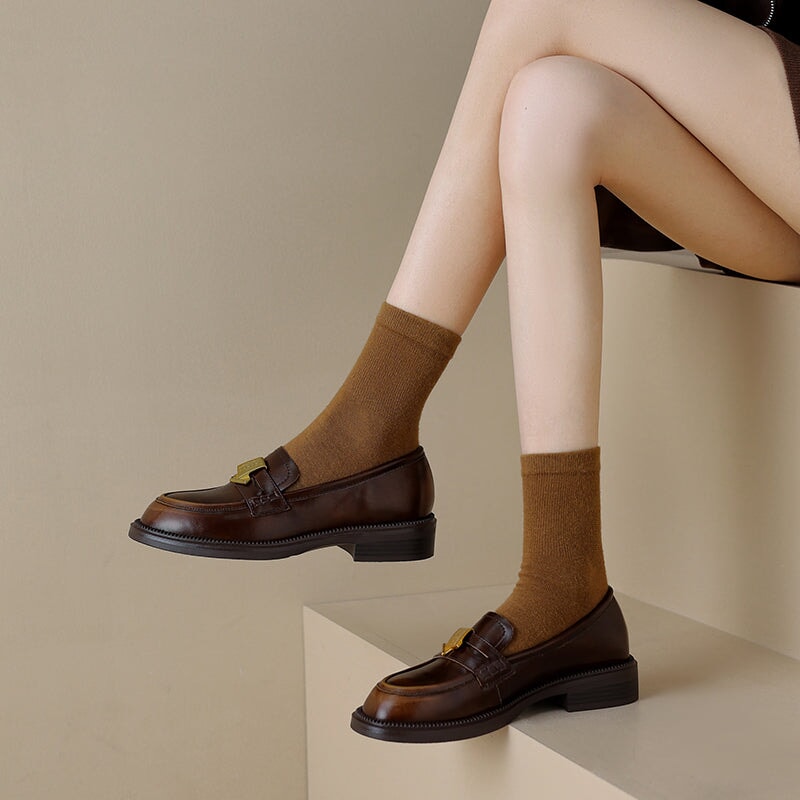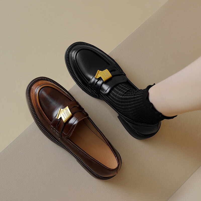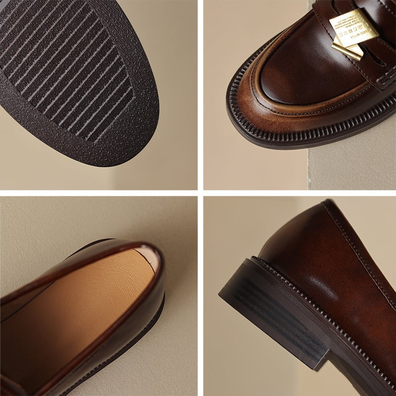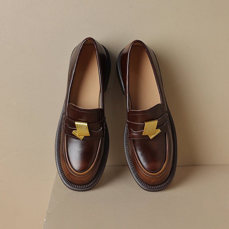 Vintage Cowhide Block Heel Penny Loafers with Metal Accent in Black/Brown