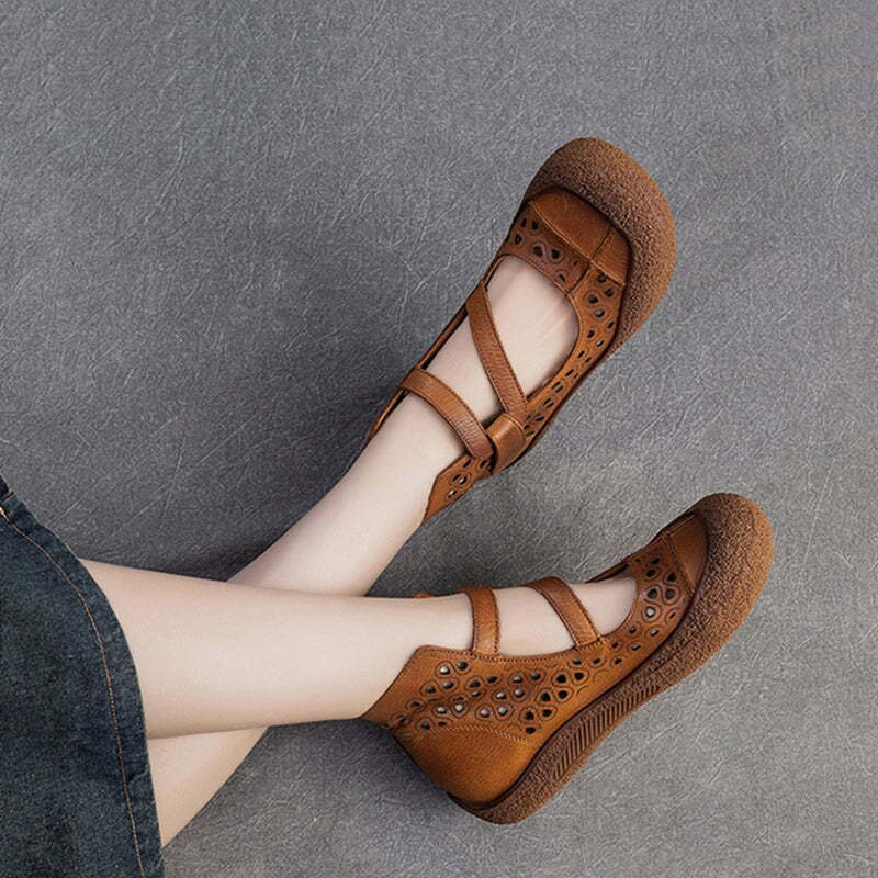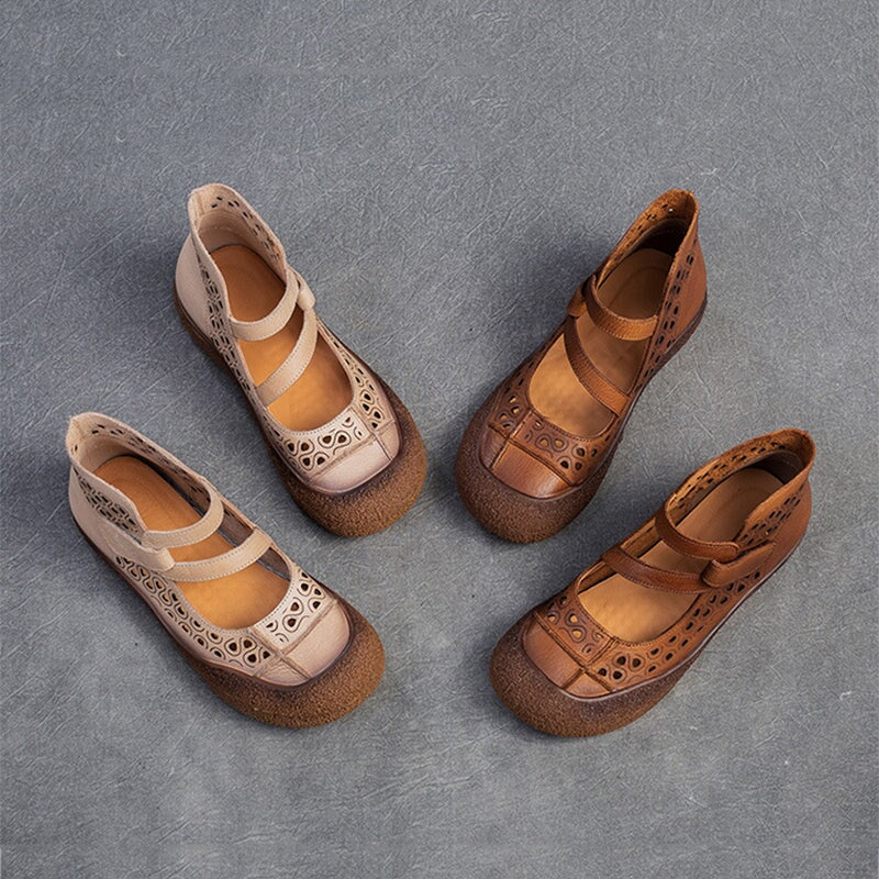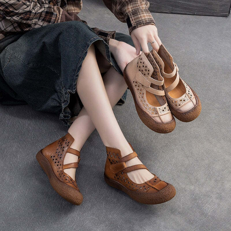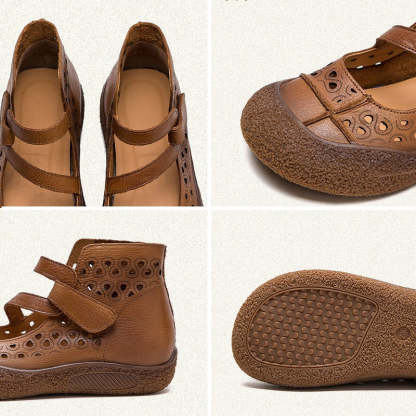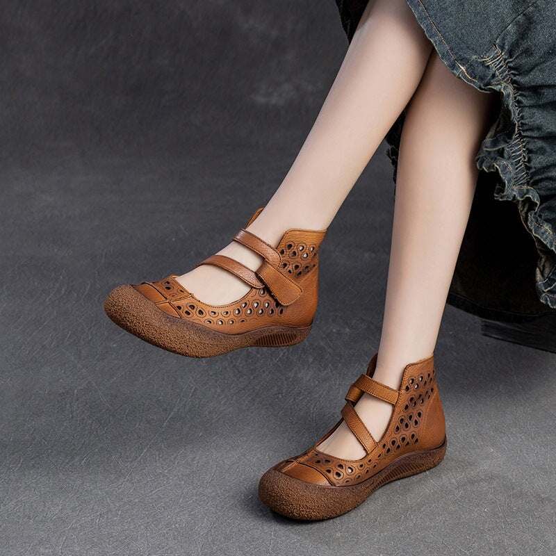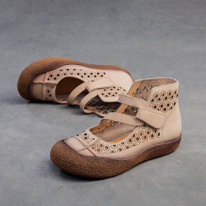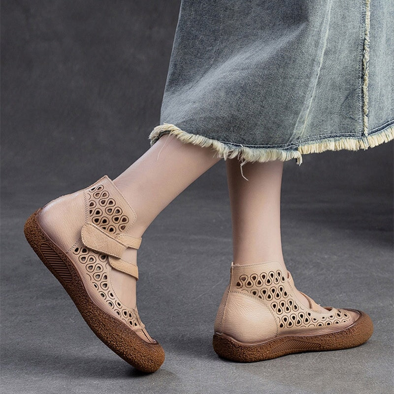 Vintage Summer Boots Sandals Hollowed Round Toe Velcro Ankle Leather Sandals